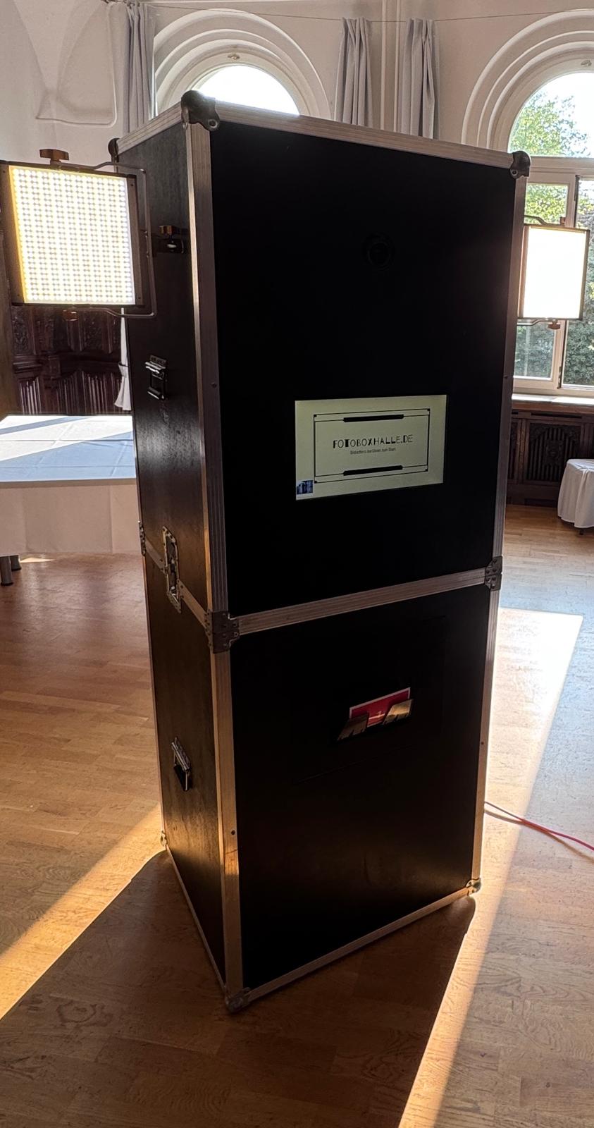Unsere FotoBox besteht aus 2 praktischen Boxen in Casebauweise. In der oberen Box befindet sich unsere Spiegelreflexkamera, die für bestechend gute Bilder von Ihnen sorgt. Außerdem befindet sich das Herz der Box, ein leistungsstarker Mini-PC, ebenso dort wie unser Fotosofortdrucker der Ihnen die Bilder liefert die Sie mit nach Hause nehmen können. Natürlich bekommen Sie auch alle Bilder von uns in digitaler Form auf einem USB-Stick bereitgestellt. Damit Sie gute Fotos erhalten und alles problemlos nutzen können brauchen wir eine Mindestfläche von wenigstens 3,5m x 2 m.